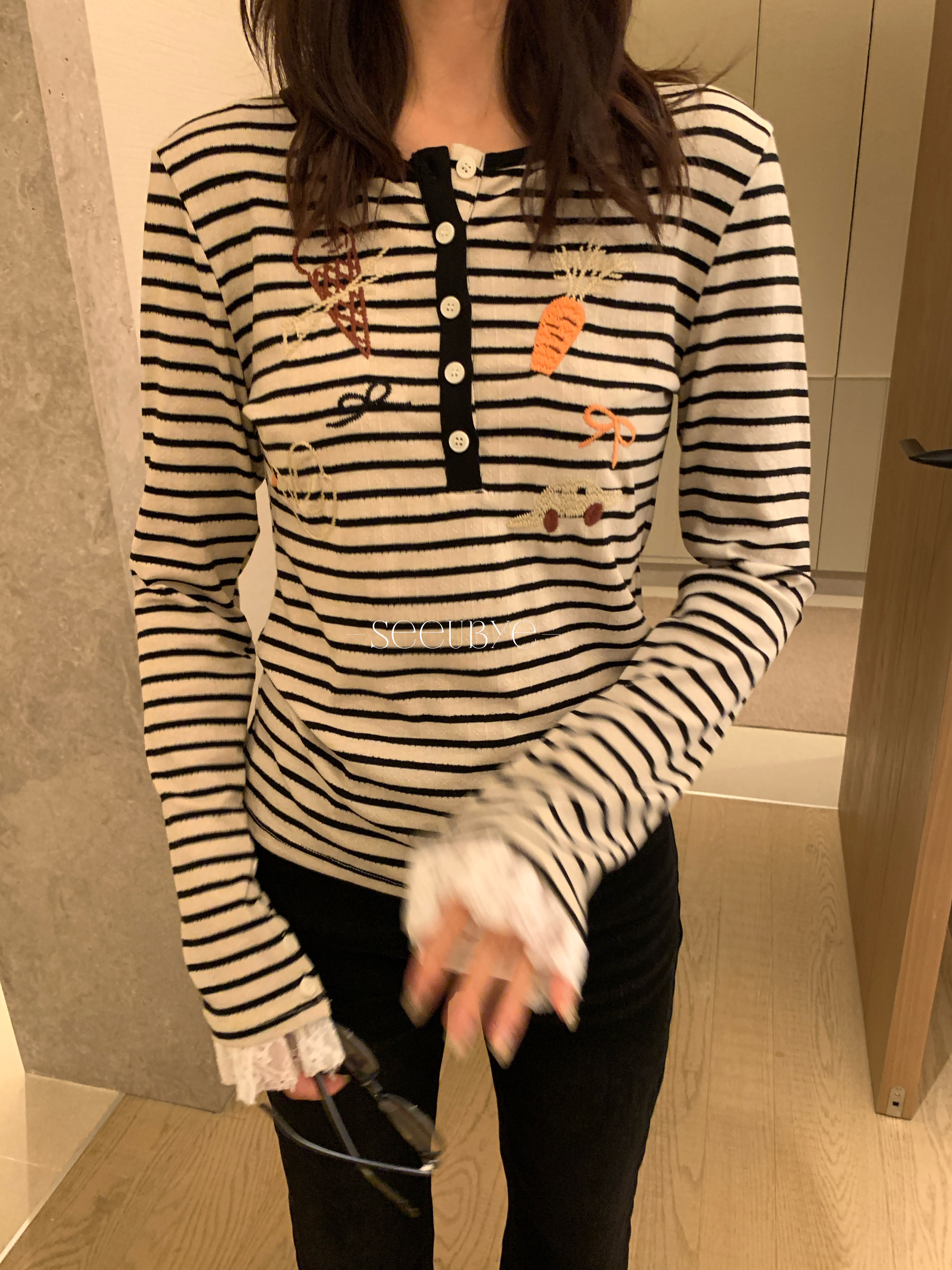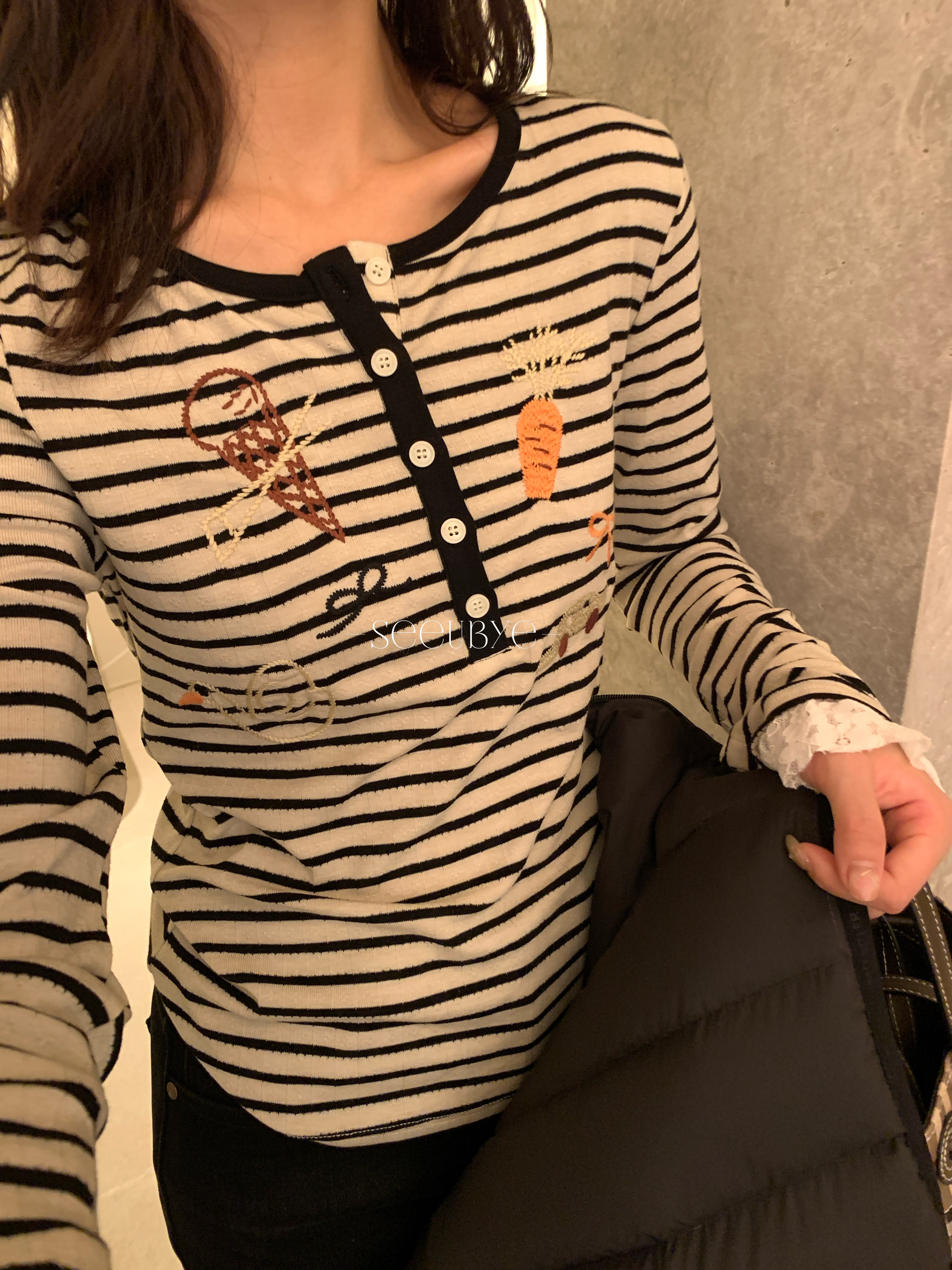 歐貨刺繡條紋拼蕾絲